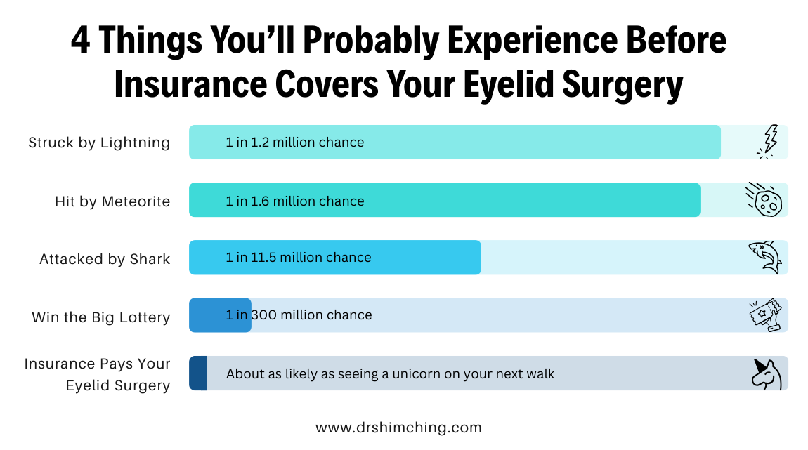 As I’m not one to quit or to tell someone to give up on something that matters to them, I’ll walk you through the process but please know, your chances of successfully getting an insurance company to cover your upper eyelid lift are less than the chance of winning a major lottery.