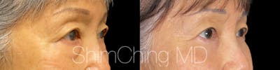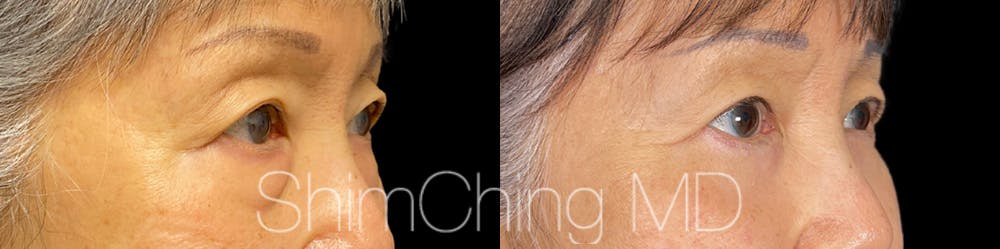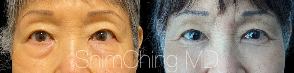 This woman came to Dr. Shim Ching’s practice in Honolulu, Hawaii, for lower eyelid surgery with canthopexy to tighten the loose skin of the outer eyes. She also had double eyelid surgery on her upper eyelids and a medical chemical peel to the under eyes.