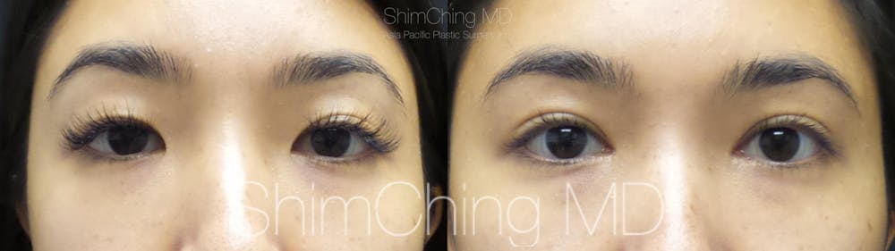This patient had double eyelid surgery, also called Asian eyelid surgery, performed in Honolulu, Hawaii, by Dr. Shim Ching. This procedure creates a defined upper eyelid fold to open the upper eye area.