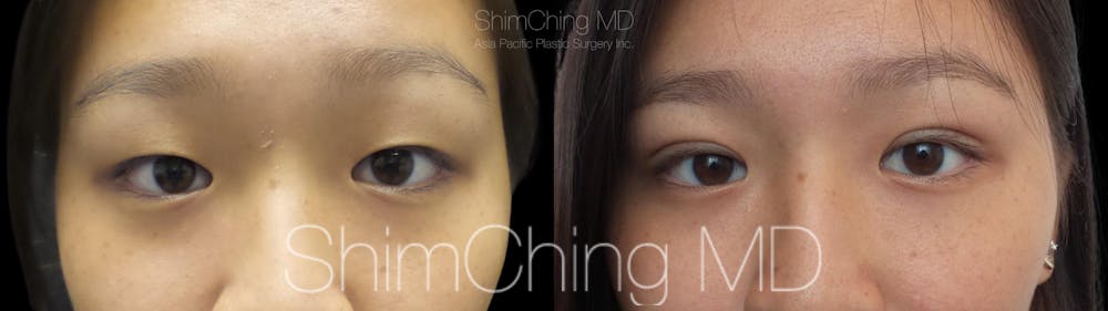 This patient had double eyelid surgery, also called Asian eyelid surgery, performed in Honolulu, Hawaii, by Dr. Shim Ching. This procedure creates a defined upper eyelid fold to open the upper eye area.