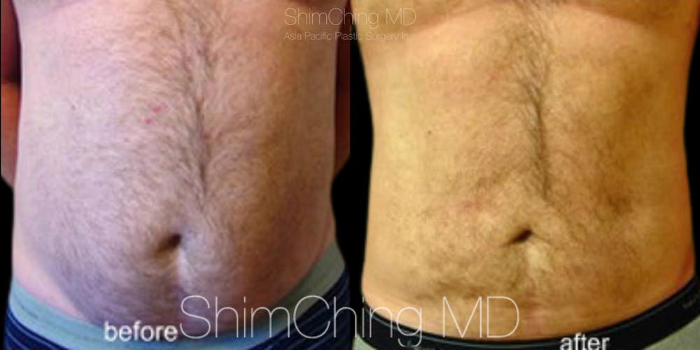 This patient had laser liposuction in Honolulu, Hawaii, by board-certified plastic surgeon Dr. Shim Ching to remove fat from the upper and lower abdomen, flanks (love handles), and lower back. The patient is shown before his procedure and 1 month later.