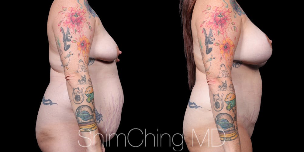 This is a 46 year old female patient before and 8 months post op mommy makeover that included a tummy tuck with liposuction to the abdomen, flanks and mons pubis, and a breast augmentation with a level 3 breast lift and liposuction to the lateral chest.