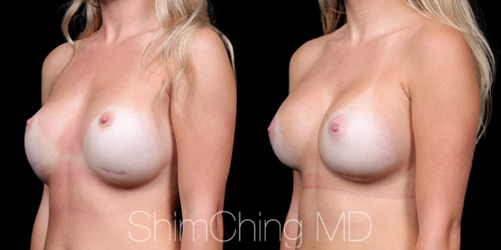 This is a 24 year old patient before and after breast revision, previous surgeon did inframammary fold, revision done with transaxillary incision