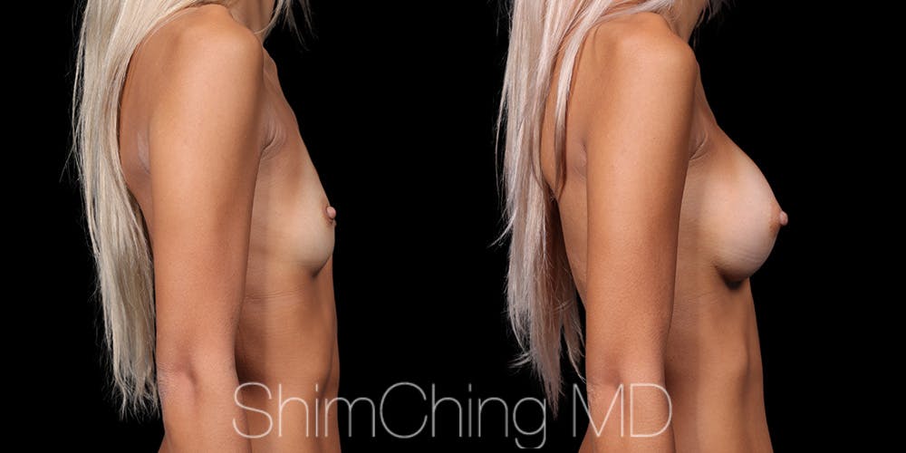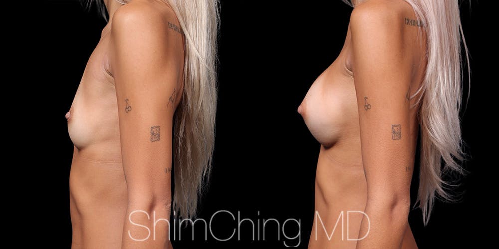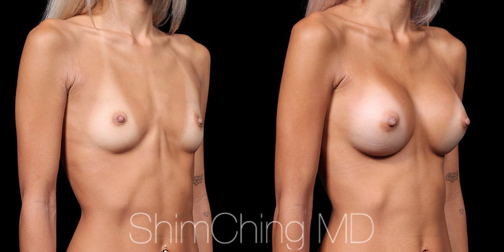 25 year old female patient before and after transaxillary breast augmentation, submuscular 240cc 275cc silicone 1 month post op