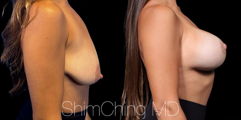 29 year old female patient before and 1 year post op level 3 breast lift with implants silicone