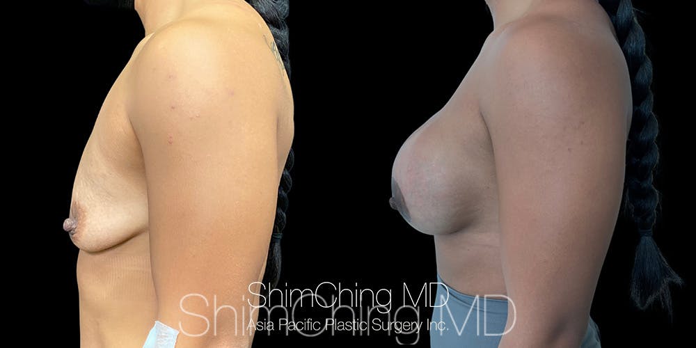 This woman had a Halo Breast Lift procedure with implants. This lift reduces the size of the areola and improves the shape of the breast with minimal scarring.