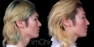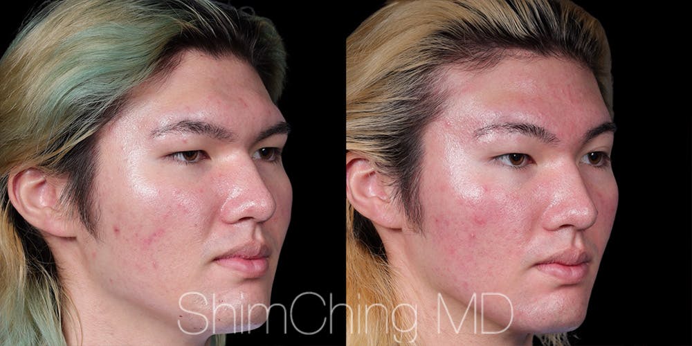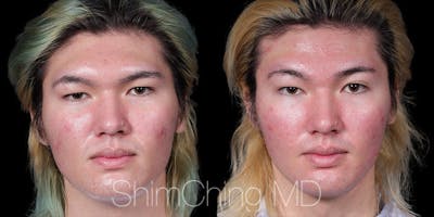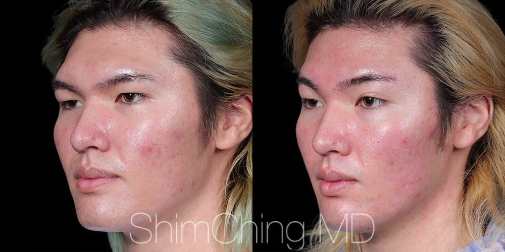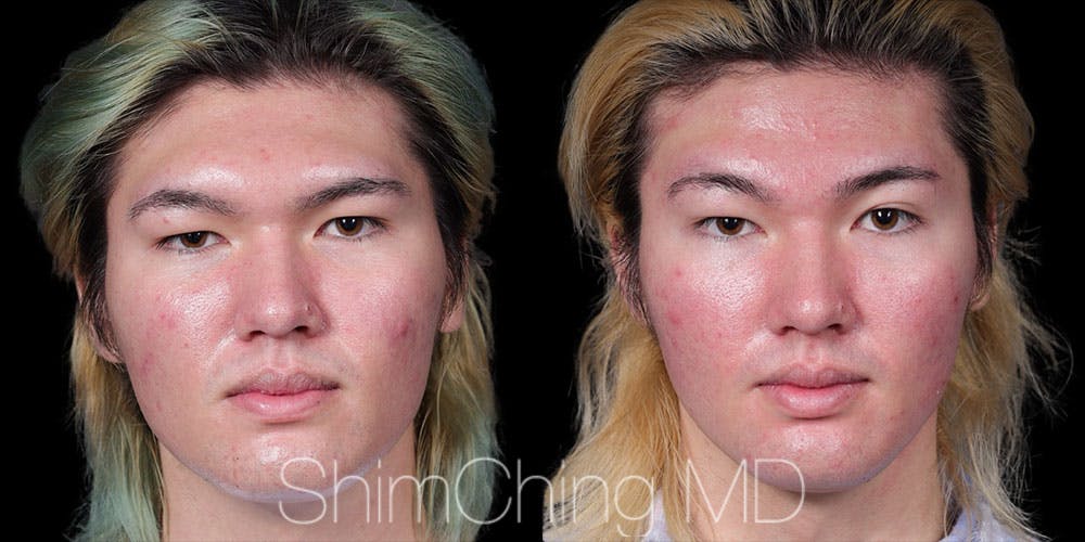 This is a 20 year old male patient before and after brow contouring to reshape the frontal bar bone of the forehead to soften a heavy brow region. The scar was hidden in the scalp and the eyebrows were lifted as well.