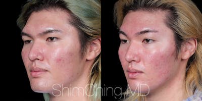 This is a 20 year old patient before and after brow contouring to reshape the frontal bar bone of the forehead to soften a heavy brow region. The scar was hidden in the scalp and the eyebrows were lifted as well.