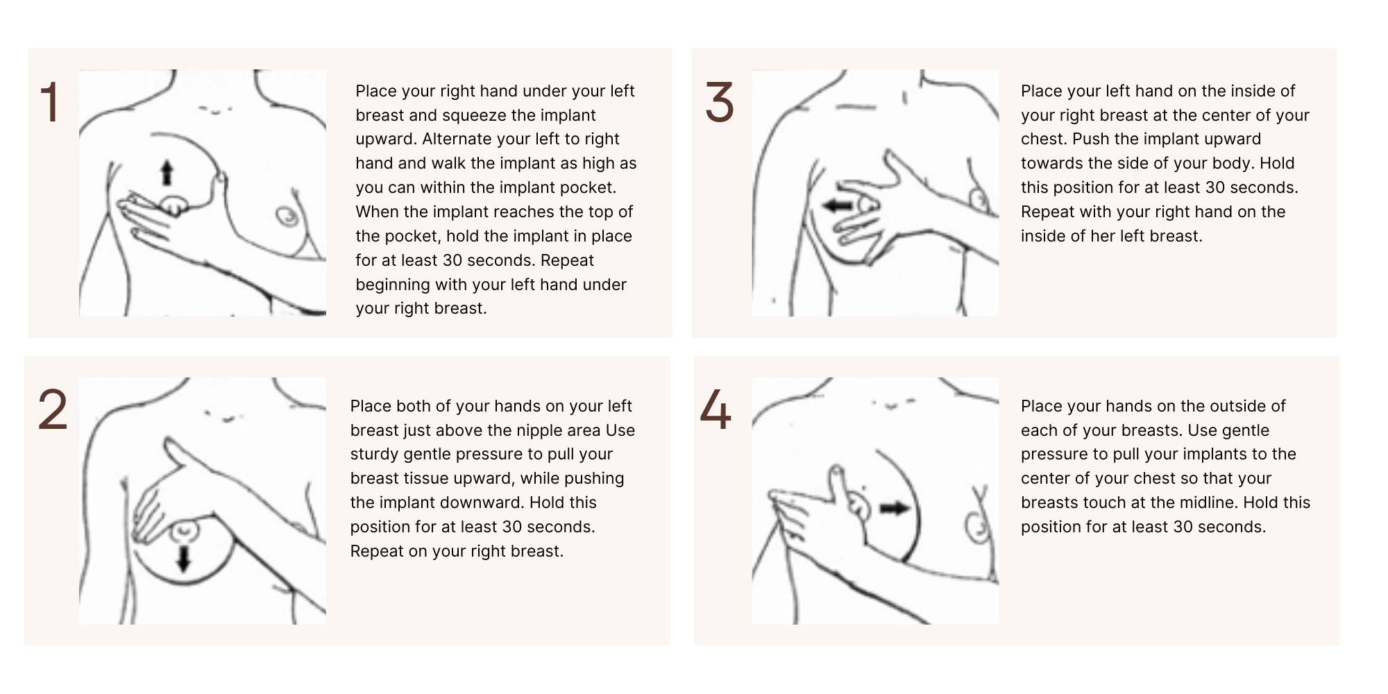 - After 4 Months and During the First Year: Continue the exercises once daily, as long as the breasts remain soft and the implants mobile.
